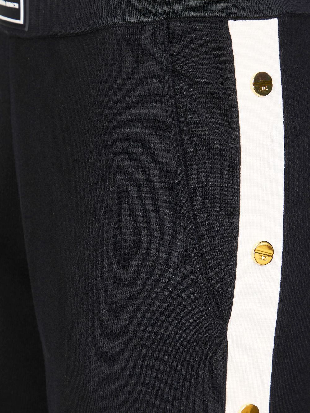 black side stripe button embellishment logo patch elasticated waistband side slit pocket Tricot trousers